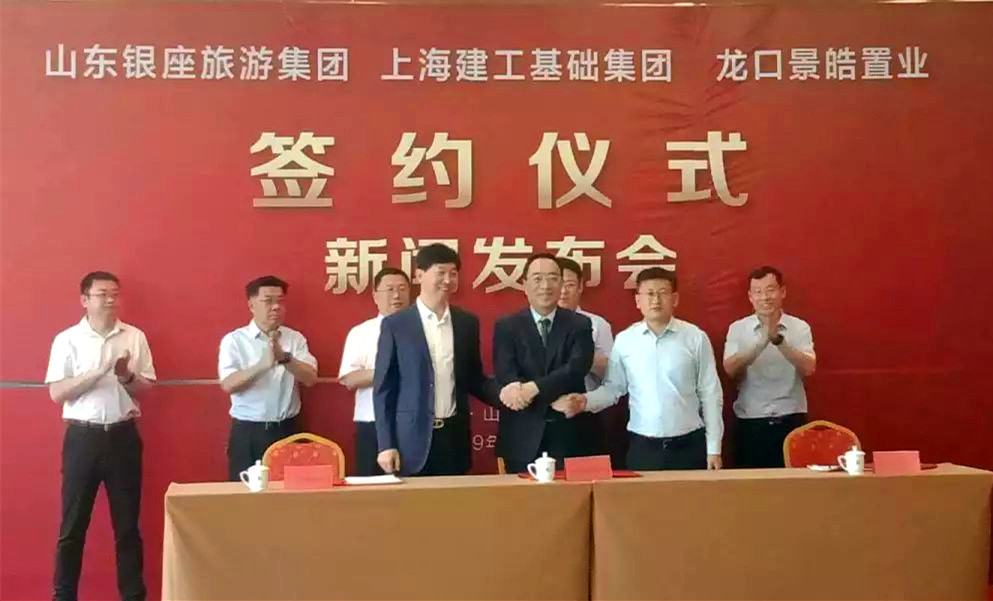 在三方领导及各界嘉宾的见证下,龙口景皓置业董事长赵仁玉、上海建工基础集团北方公司山东大区总经理程新、银座旅游集团总经理周立刚先生签订了合作协议。